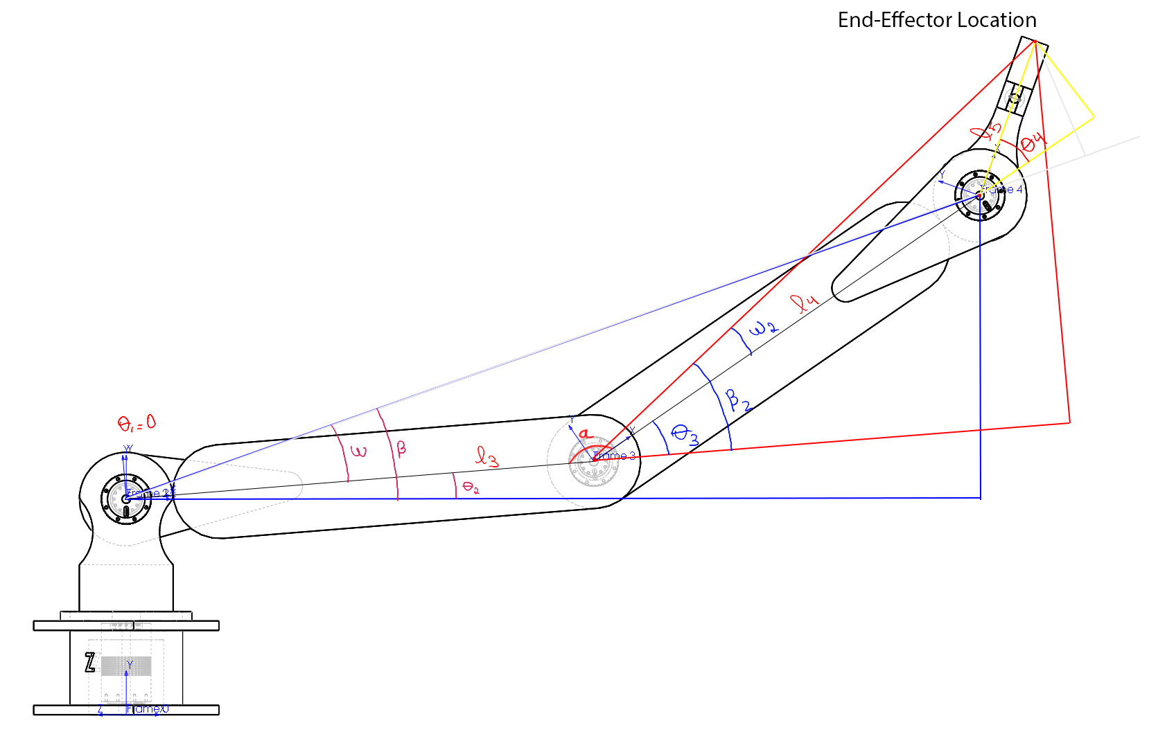 There are many methods to find the equations for the inverse kinematic here two methodologies are presented. First let's look at the trigonometric solution. For the trigonometric solution we can draw 2 triangles, on from frame to and the second one from frame to frame . This way we can study the relation between the angles.