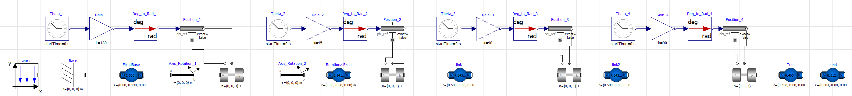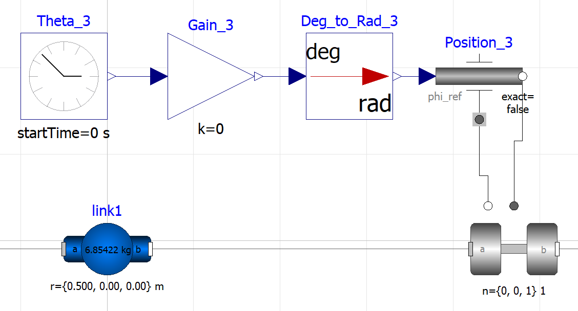To simulate the manipulator the component was used for the joints, and was used for the links, base and tool, and also some auxiliary component blocks to simulate controllers, world conditions and a fixed base (ground). On the component for the joints the option , allow the control of the rotation and this option was used as shown on the parameters on the Figure below. A unit conversion block has to be used to convert from degrees to radians, there is a math block for that. With this control system the position can provide for by setting a value to the block. This will take the gain input and will provide it as a signal that the joint can use. This 6 blocks represent the first joint link of the system as represented on the Figure below.