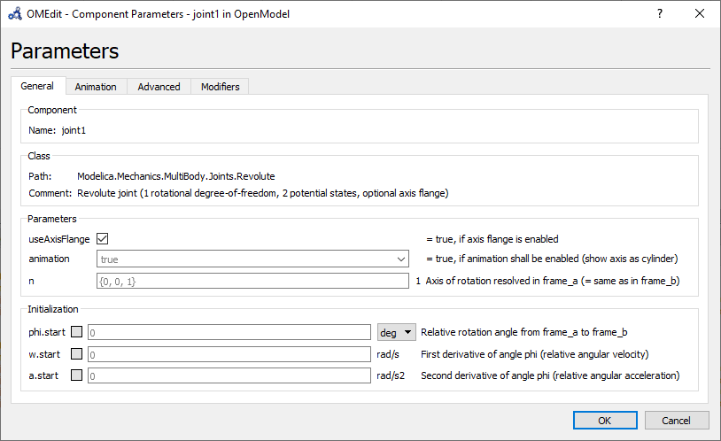 Here the simulation modelling at OpenModelica is shown, the parameters used at the block results in an animation, that goes from all the angles been 0 to the values set.