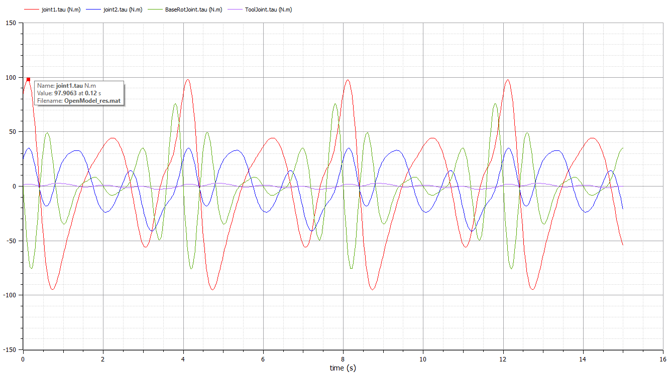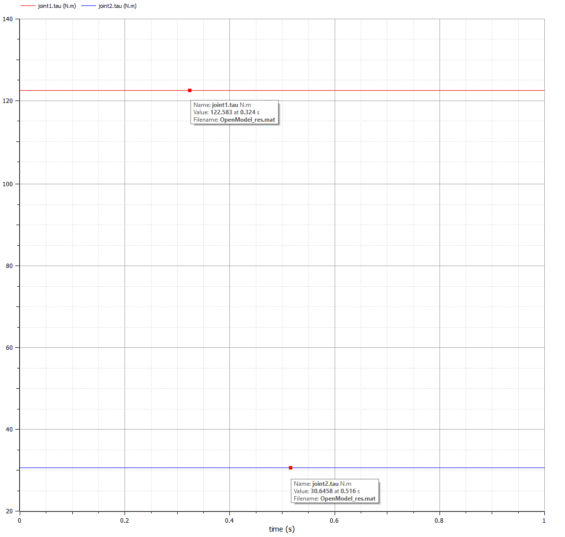 The calculations for the moments of inertia were made in Python, refer to Appendix A, and confirmed in the mass evaluation at SolidWorks, also, in OpenModelica, as can be seen see on the Figure below the values for the torque for joint 1 and 2 using = .