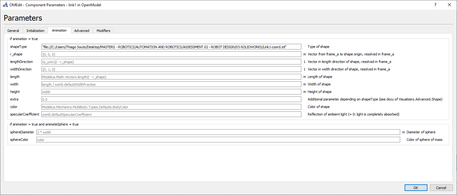 There are many ways to export from one software to the other, on this project approach, at the export STL window, the coordinate system is been output, as can be seen in the import parameters for link 1 on the Figure below, by exporting the coordinate system placed on the frame position, also on the following Figure below, the vector from frame to the shape origin, resolved in is equal to 0, because the frame coordinate system exported is located at the origin.