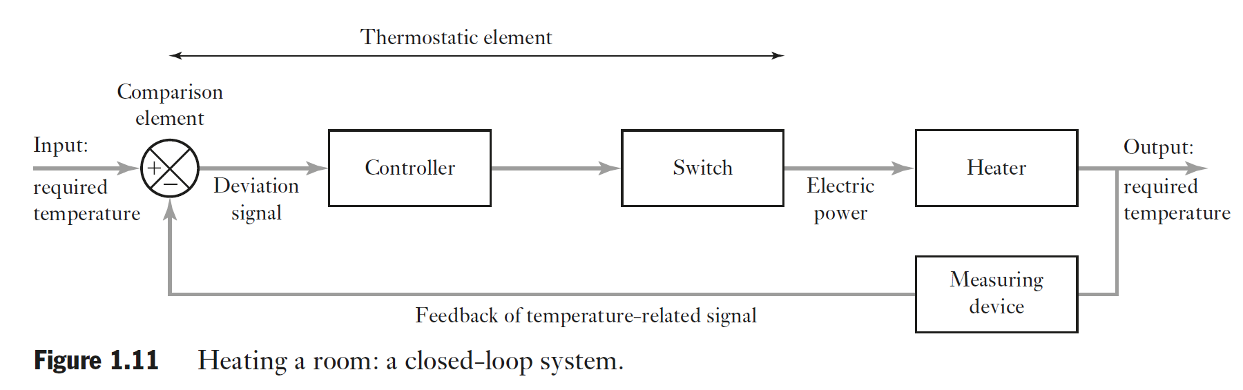- Identify the various elements that might be present in a control system involving a thermostatically controlled electric heater.