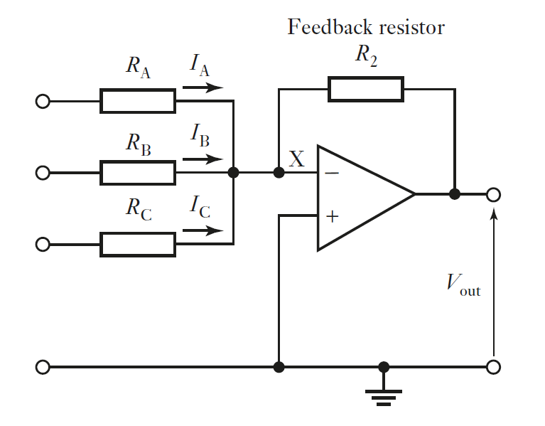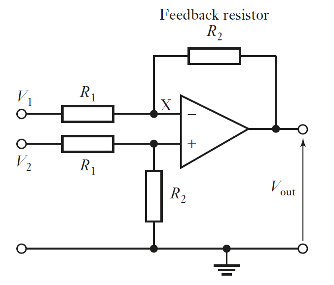 A difference amplifier is one that amplifies the difference between two input voltages. Figure 3.7 shows the circuit. Since there is virtually no current through the high resistance in the operational amplifier between the two input terminals, there is no potential drop and thus both the inputs X will be at the same potential. The voltage is across resistors and in series. Thus the potential at X is: