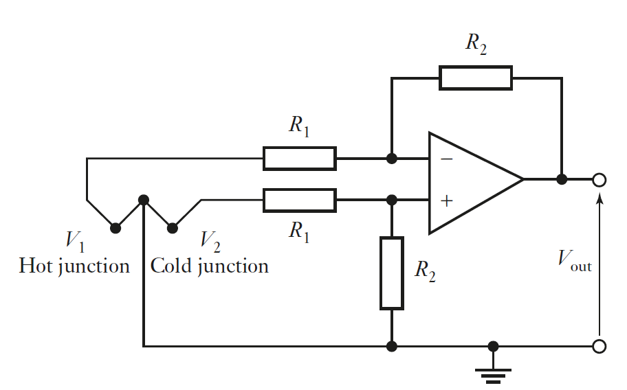 As an illustration of the use of such a circuit with a sensor, Figure 3.8 shows it used with a thermocouple. The difference in voltage between the of the two junctions of the thermocouple is being amplified. The values of and can, for example, be chosen to give a circuit with an output of for a temperature difference between the thermocouple junctions of if such a temperature difference produces an difference between the junctions of . For the circuit we have: