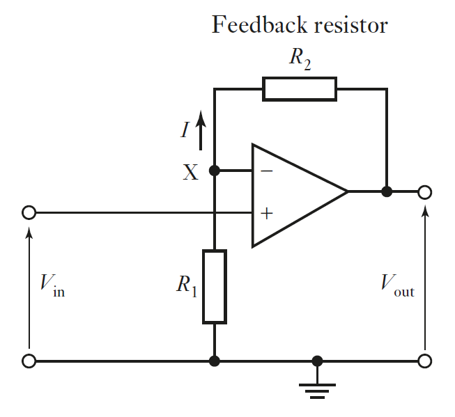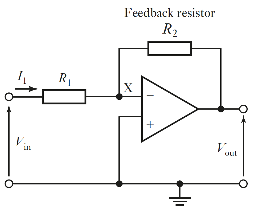 The input is taken to the inverting input through a resistor R1 with the non-inverting input being connected to ground. A feedback path is provided from the output, via the resistor R2 to the inverting input.