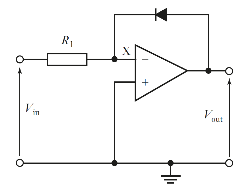 Then, since the current through the feedback loop is the same as the current through the input resistance and the potential difference across the diode is $-V_{out}, we have
